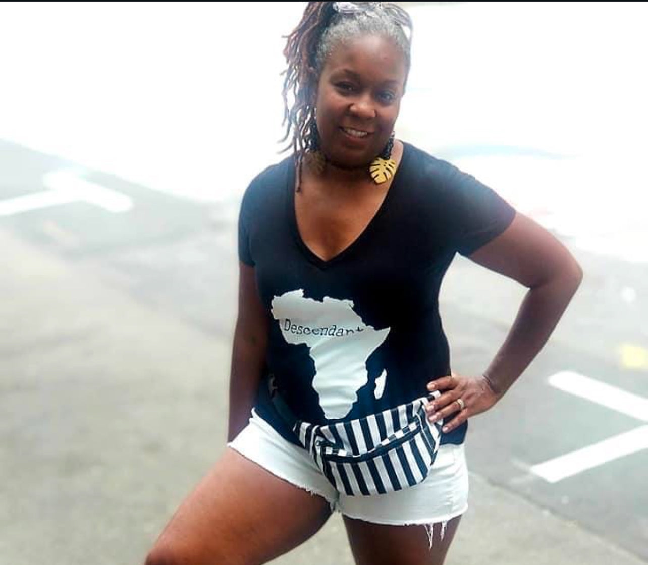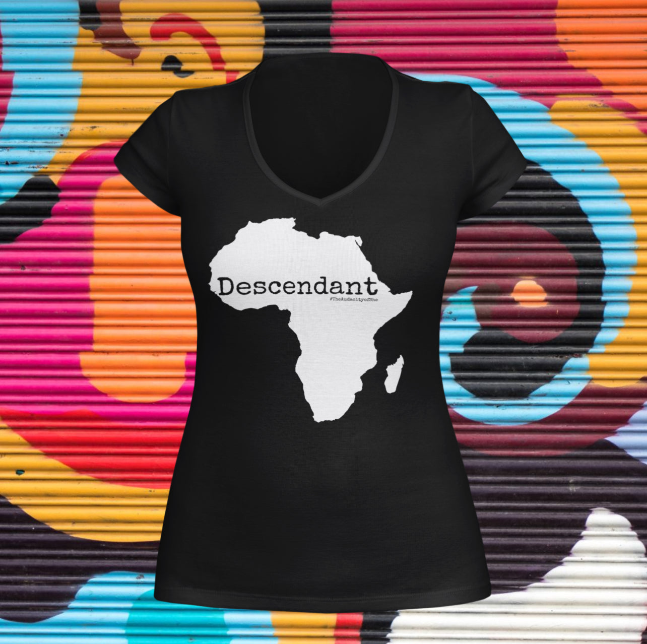 ALL V NECK ARE SLIM FIT. PLEASE SIZE UP! Showcase your roots with the ladies Descendant V neck. Featuring the bold outline of Africa and the word "Descendant," this design honors ancestry and cultural pride. Crafted from premium materials, this cotton v neck is as comfortable as it is meaningful. Perfect for everyday wear or as a statement piece, it’s a tribute to heritage, history, and identity.